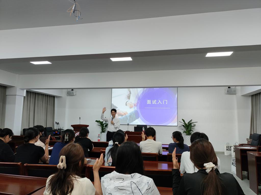 嚴景城為同學們作求職能力提升培訓,他從面試基本問題、面試必備技能、生涯規劃等方面進行講解,并邀請同學們參與互動。同學們在小組討論和互動分享過程中主動思考、相互完善,將培訓內容高效吸收,取得了良好效果。