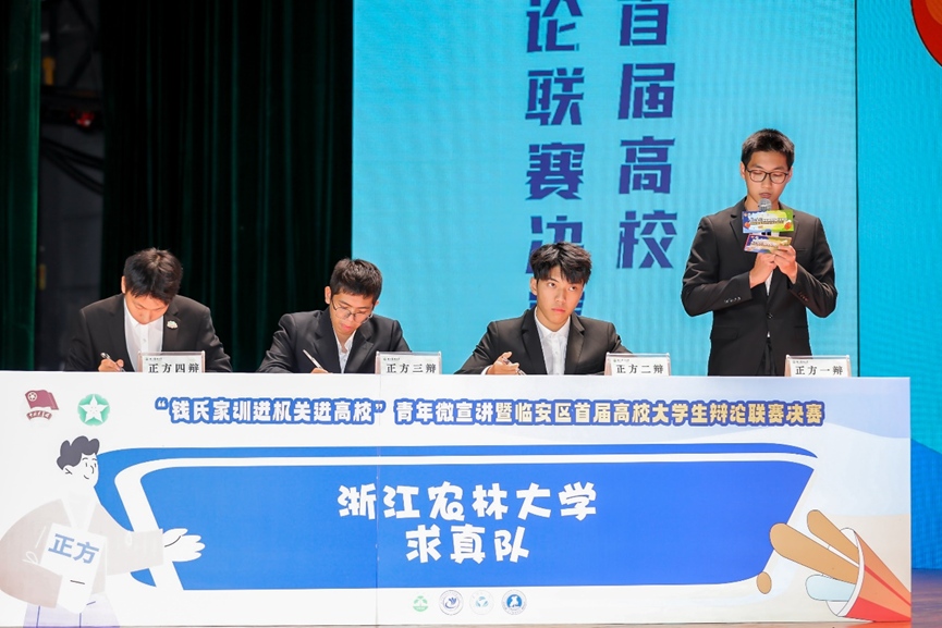 在首屆臨安區(qū)高校大學(xué)生辯論聯(lián)賽中,浙江農(nóng)林大學(xué)和浙江警察學(xué)院兩支隊(duì)伍圍繞“‘在城市’/‘去鄉(xiāng)村’工作是當(dāng)代青年人的好出路”展開(kāi)激烈辯論。比賽過(guò)程中,雙方辯手字字珠璣,句句鏗鏘,發(fā)言或直抒胸臆,或語(yǔ)鋒敏捷,各據(jù)營(yíng)壘,慷慨激昂,既體現(xiàn)了團(tuán)隊(duì)成員間的默契配合,貢獻(xiàn)了天目青年的思辨力量,也展現(xiàn)了臨安區(qū)大學(xué)生的青春風(fēng)采。