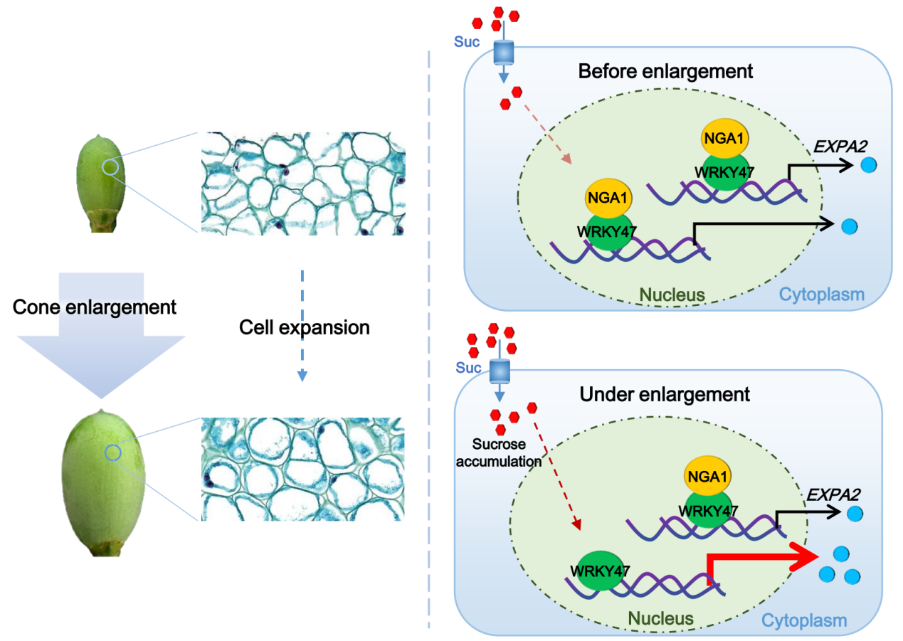 該研究采用13C標記和蔗糖處理等試驗,明確了蔗糖誘導的細胞體積增大對香榧球果膨大具有重要作用。通過轉錄組測序、基因功能驗證等手段,證實了香榧擴張蛋白基因TgEXPA2可正向調節細胞擴張促進球果膨大。進一步研究發現轉錄因子TgWRKY47通過直接結合到TgEXPA2啟動子而增強其表達。此外,研究還發現,NGATHA轉錄因子TgNGA1直接與TgWRKY47相互作用,從而抑制TgWRKY47對TgEXPA2的調控作用。綜上所述,我們的研究結果揭示了蔗糖與香榧球果膨大之間的關聯,并闡明了分子調控機制。
