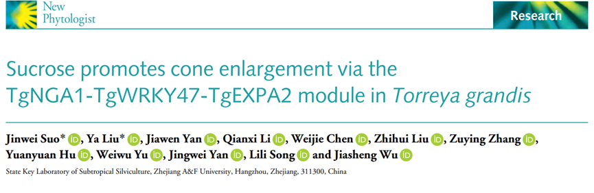 近日,國家重點實驗室特色干果研究團隊(吳家勝教授)在國際植物科學領域權威雜志《New Phytologist》(中科院一區Top,IF-5yr=10.2)在線發表了題為《蔗糖通過TgNGA1-TgWRKY47-TgEXPA2模塊參與調控香榧球果膨大》(Sucrose promotes cone enlargement via the TgNGA1-TgWRKY47-TgEXPA2 module inTorreya grandis)的研究論文,首次解析了調控香榧球果膨大的新機制。