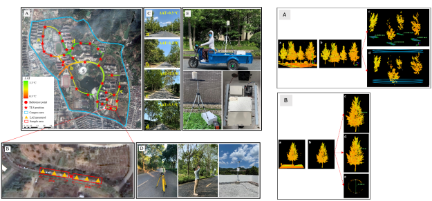 本研究采用地基雷達技術獲取行道樹的冠層3D結構,采用移動式無線傳感設備獲取路面上方的環境參數,利用無人機影像對不同尺度下的道路周圍土地覆蓋類型進行分類,量化了四種冠形和兩種種植方式的行道樹降溫增濕效應。該研究結果提取了冠層主要結構參數,建立結構參數與降溫增濕間的關系;探討了不同冠形和種植方式對降溫增濕的影響;研究了不同尺度下周圍環境對城市道路夏季降溫的影響。這些發現為城市規劃和環境改善提供了重要依據,也為城市綠地管理者和規劃者提供了有效建議。
